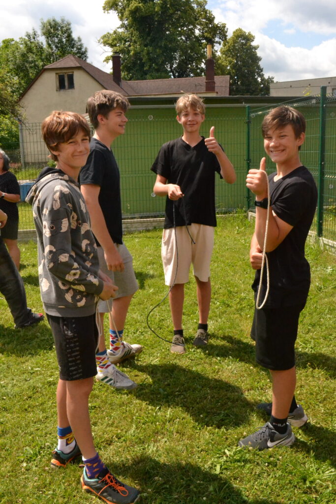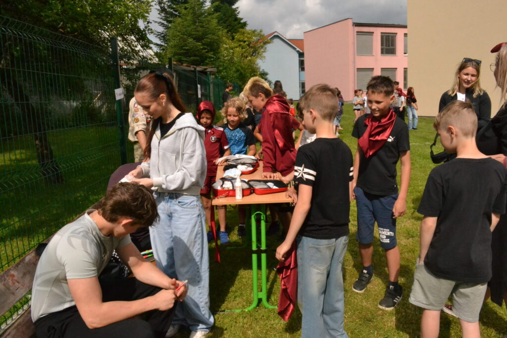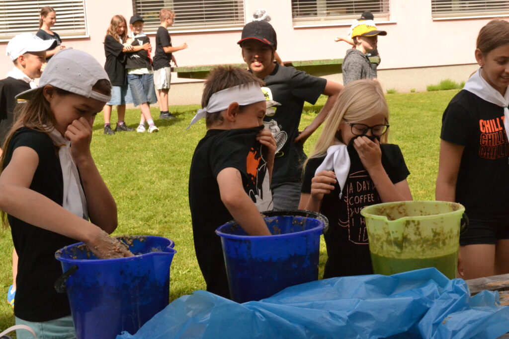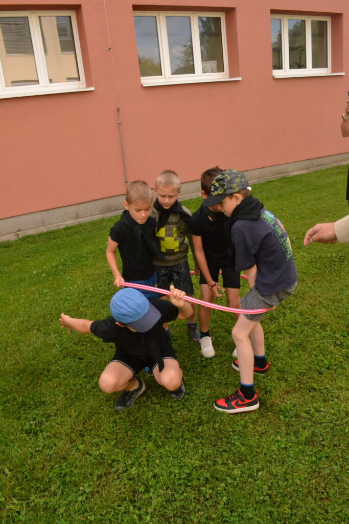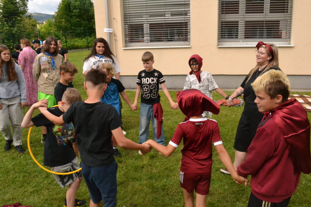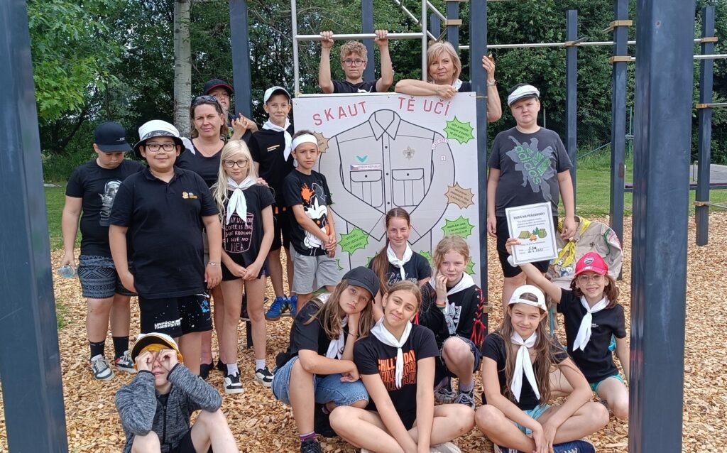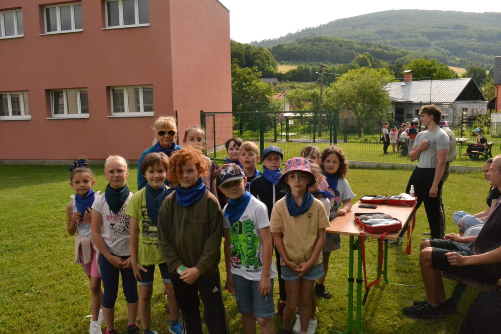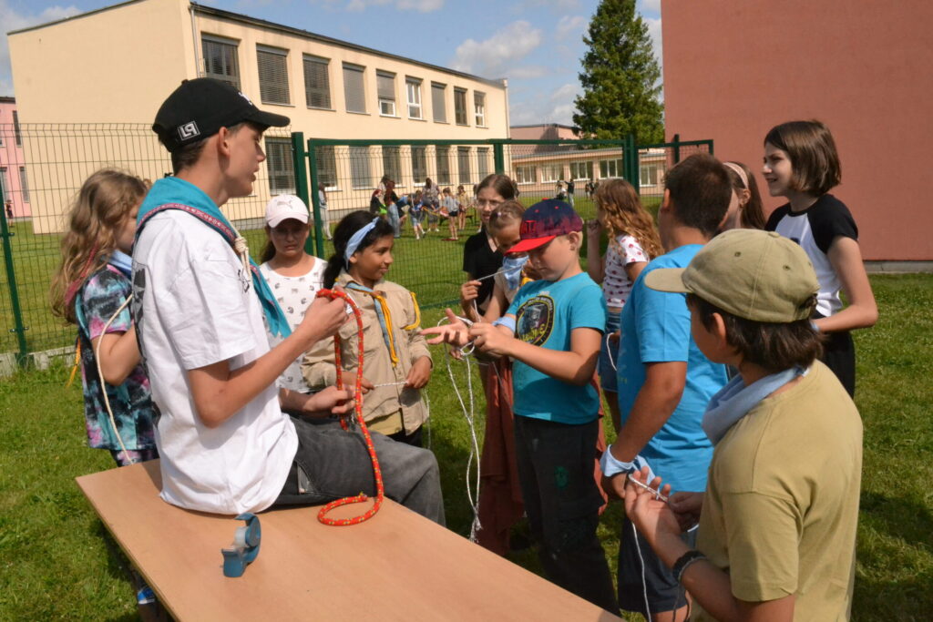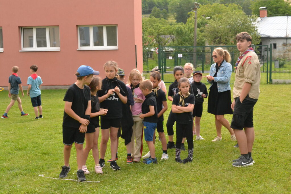 Za krásného letního počasí se po roce na školním hřišti zase sešli všichni z naší školy. Návod, jak přežít prázdniny, nám dali zlatohorští skauti z řad našich starších žáků. Na šesti stanovištích si děti mohly vyzkoušet znalosti a dovednosti ze zdravovědy, uzlování, spolupráci v týmu, šifrování a také se pokusili překonat sami sebe a sáhnout si na dno. A to doslova – na dno kbelíku s nevábným (ale bezpečným) obsahem. Všichni našli “zlaté vejce”, ve kterém se skrývala indicie, což byl název některé z nášivek, kterou pak u obří skautské košile našli a přilepili. Moc děkujeme všem deváťákům a dalším několika pomocníkům z nižších ročníků. Na stanovištích si vedli skvěle, s ostatními malými i velkými spolužáky mluvili jako profesionálové a vysloužili si respekt všech. Celé dopoledne jim muselo dát pořádně zabrat, ale vůbec to na nich nebylo vidět. Ještě jednou velké díky, budete nám moc chybět 🙂