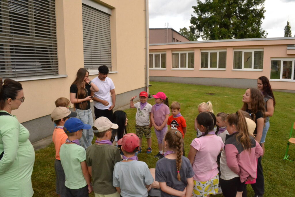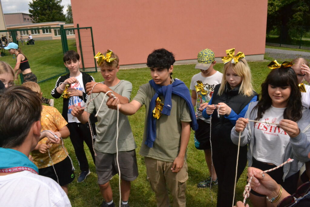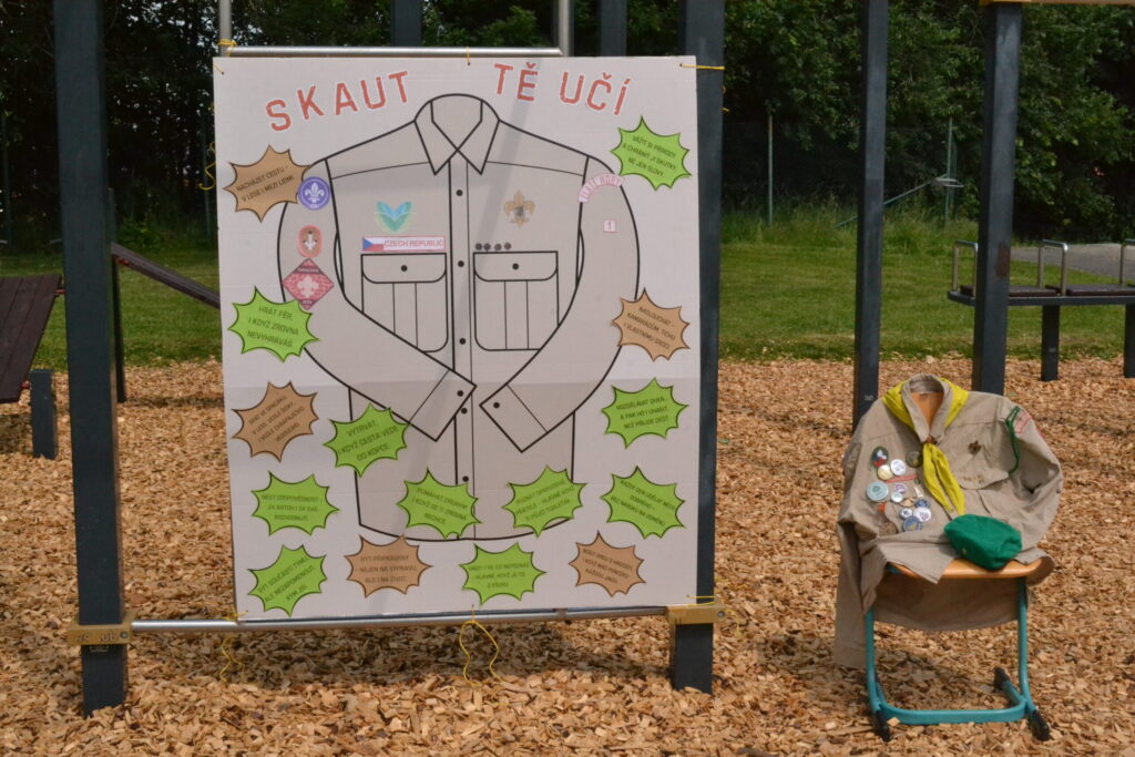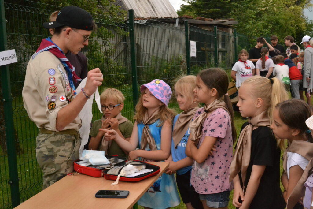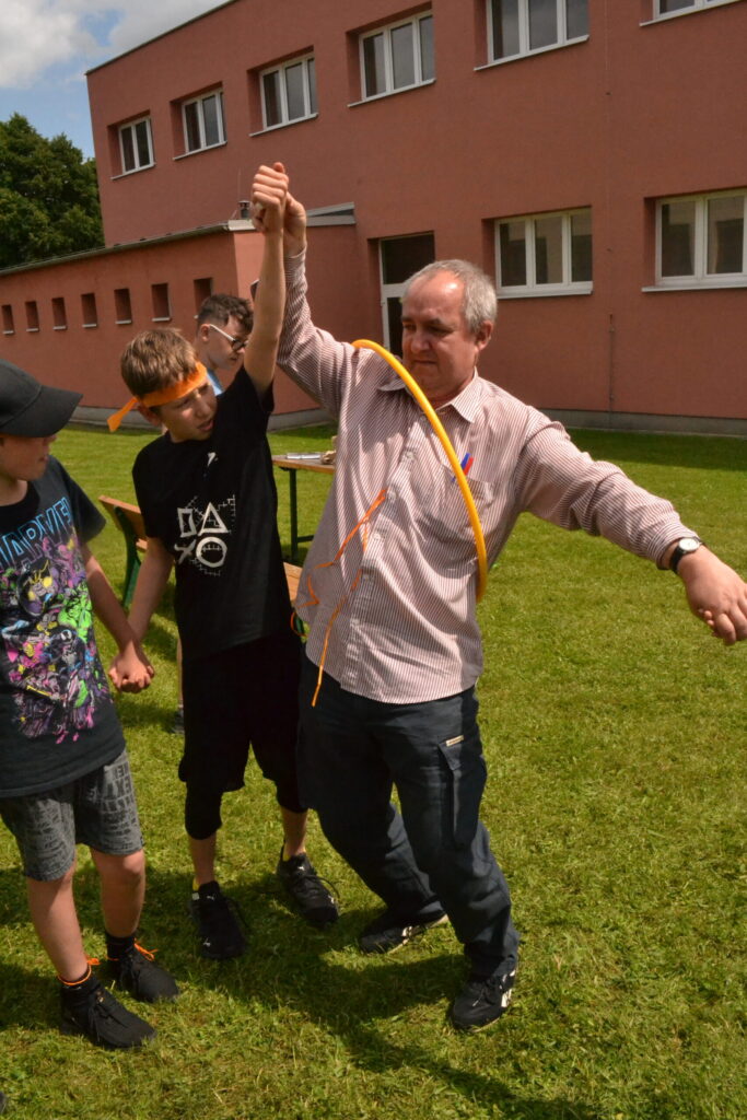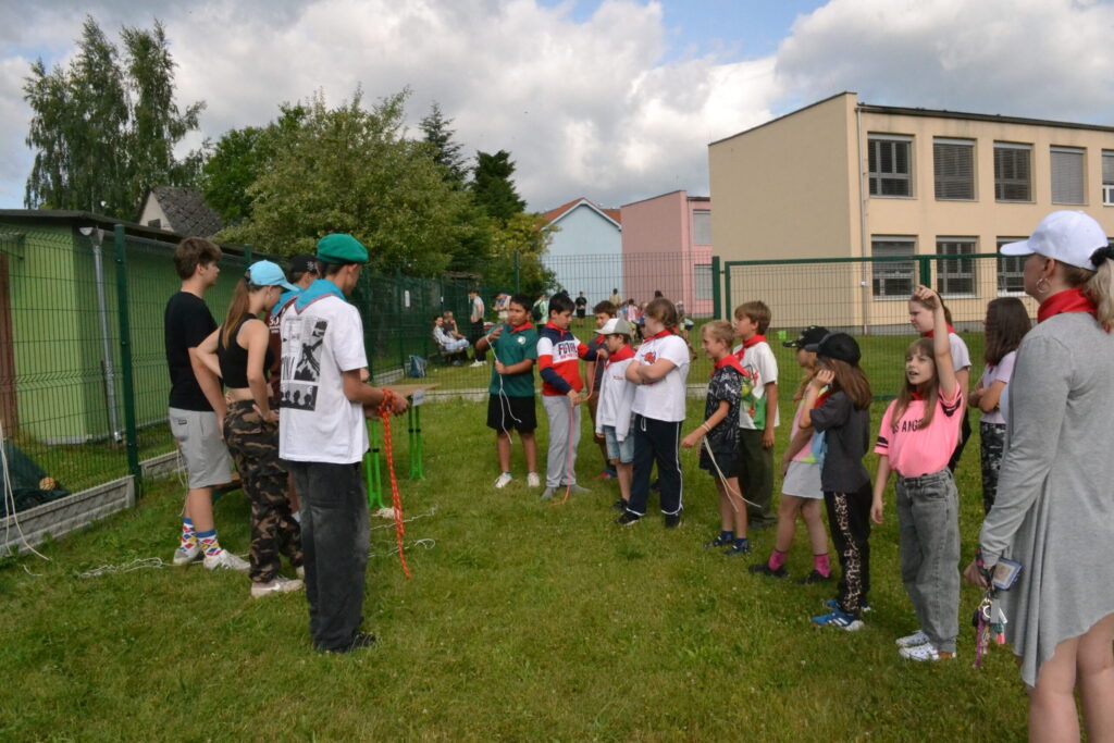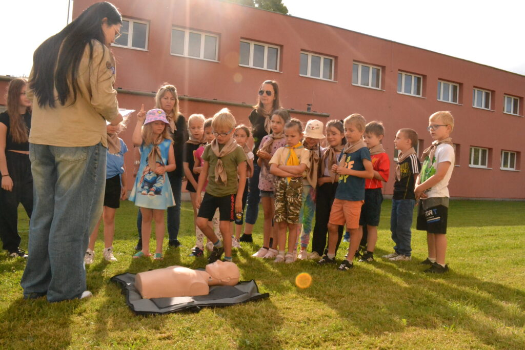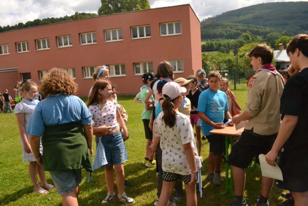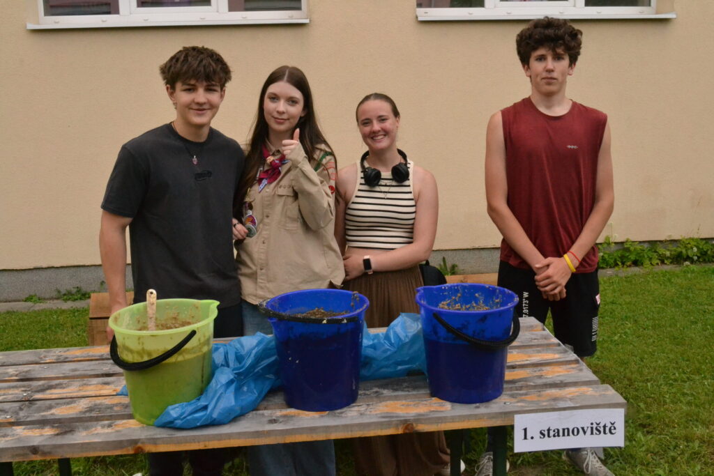Za krásného letního počasí se po roce na školním hřišti zase sešli všichni z naší školy. Návod, jak přežít prázdniny, nám dali zlatohorští skauti z řad našich starších žáků. Na šesti stanovištích si děti mohly vyzkoušet znalosti a dovednosti ze zdravovědy, uzlování, spolupráci v týmu, šifrování a také se pokusili překonat sami sebe a sáhnout si na dno. A to doslova – na dno kbelíku s nevábným (ale bezpečným) obsahem. Všichni našli “zlaté vejce”, ve kterém se skrývala indicie, což byl název některé z nášivek, kterou pak u obří skautské košile našli a přilepili. Moc děkujeme všem deváťákům a dalším několika pomocníkům z nižších ročníků. Na stanovištích si vedli skvěle, s ostatními malými i velkými spolužáky mluvili jako profesionálové a vysloužili si respekt všech. Celé dopoledne jim muselo dát pořádně zabrat, ale vůbec to na nich nebylo vidět. Ještě jednou velké díky, budete nám moc chybět 🙂