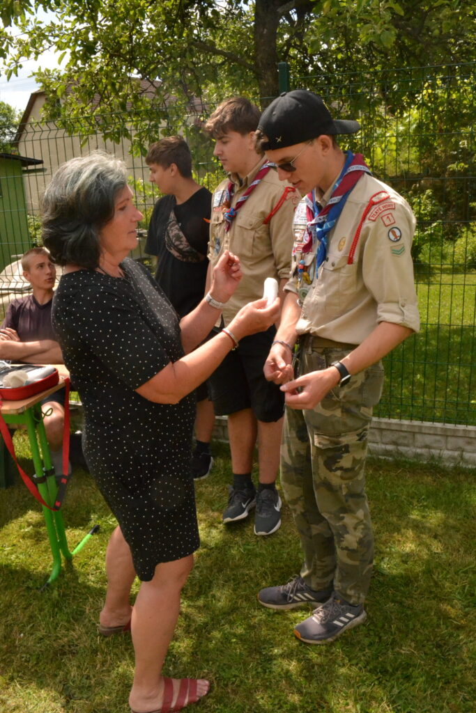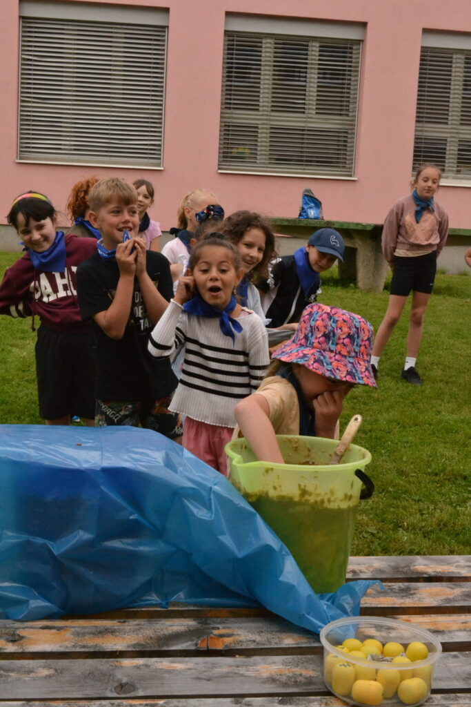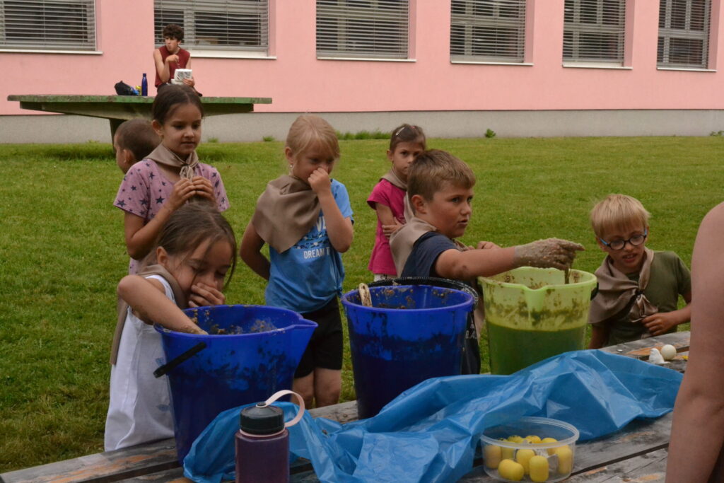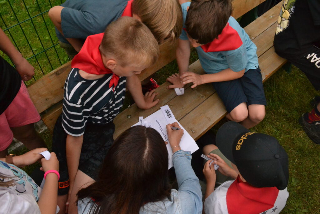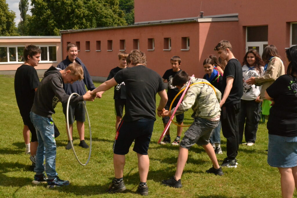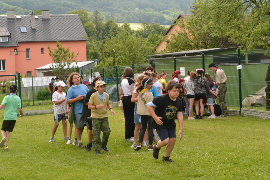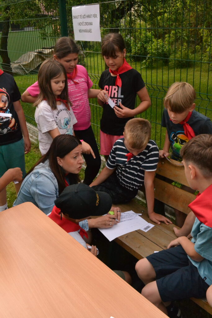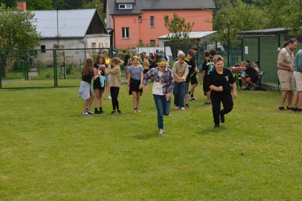 Za krásného letního počasí se po roce na školním hřišti zase sešli všichni z naší školy. Návod, jak přežít prázdniny, nám dali zlatohorští skauti z řad našich starších žáků. Na šesti stanovištích si děti mohly vyzkoušet znalosti a dovednosti ze zdravovědy, uzlování, spolupráci v týmu, šifrování a také se pokusili překonat sami sebe a sáhnout si na dno. A to doslova – na dno kbelíku s nevábným (ale bezpečným) obsahem. Všichni našli “zlaté vejce”, ve kterém se skrývala indicie, což byl název některé z nášivek, kterou pak u obří skautské košile našli a přilepili. Moc děkujeme všem deváťákům a dalším několika pomocníkům z nižších ročníků. Na stanovištích si vedli skvěle, s ostatními malými i velkými spolužáky mluvili jako profesionálové a vysloužili si respekt všech. Celé dopoledne jim muselo dát pořádně zabrat, ale vůbec to na nich nebylo vidět. Ještě jednou velké díky, budete nám moc chybět 🙂