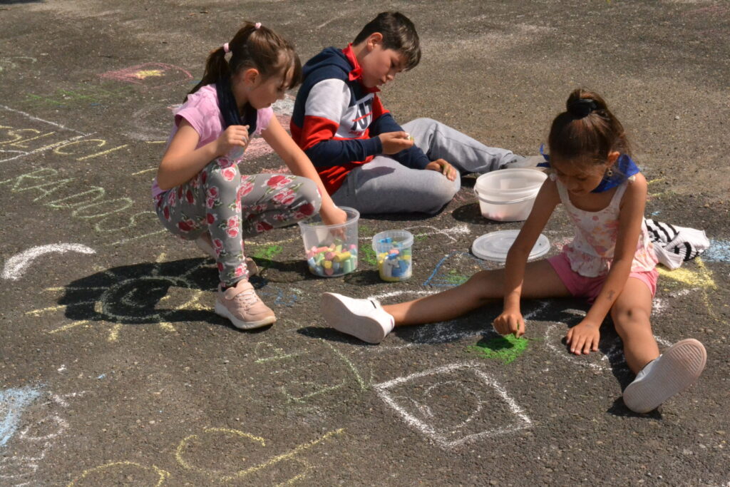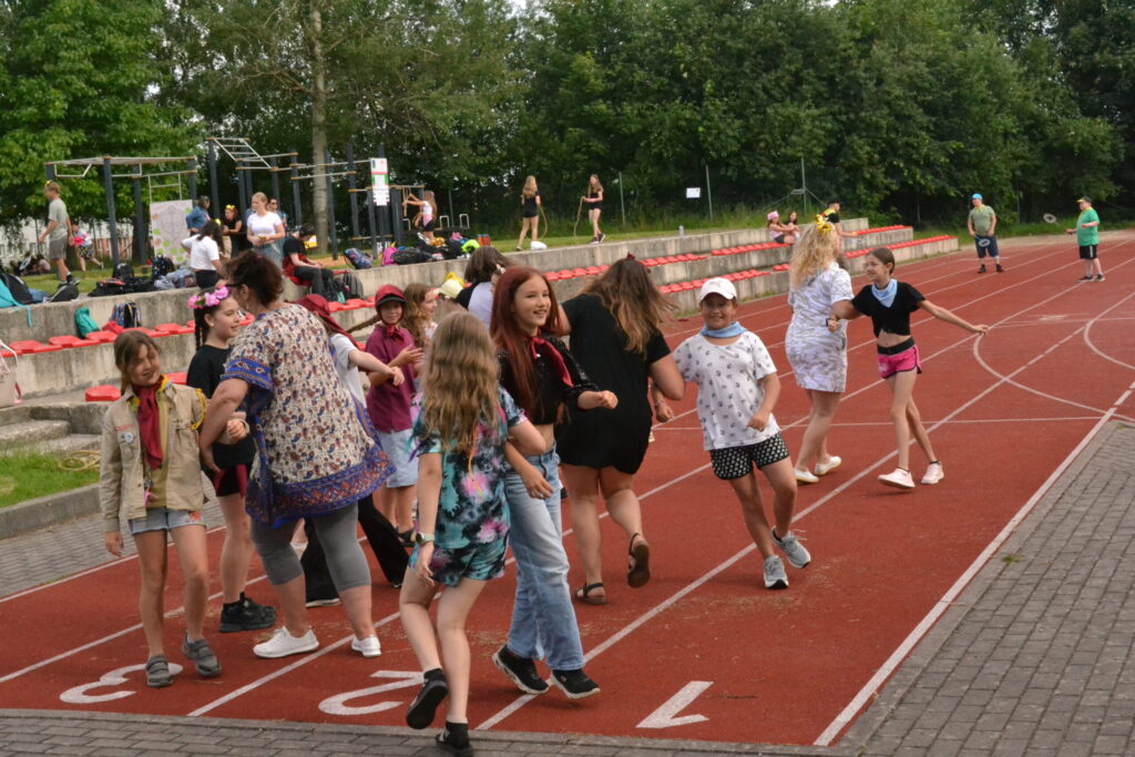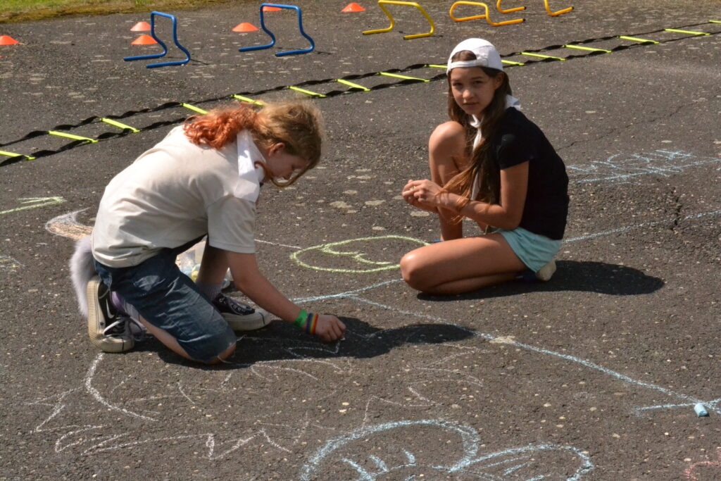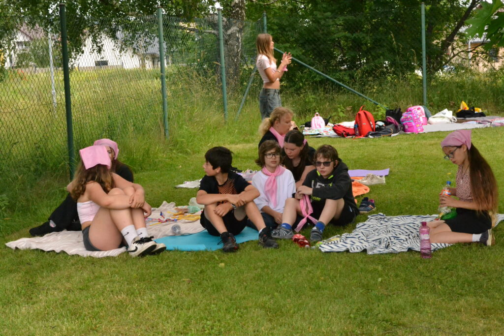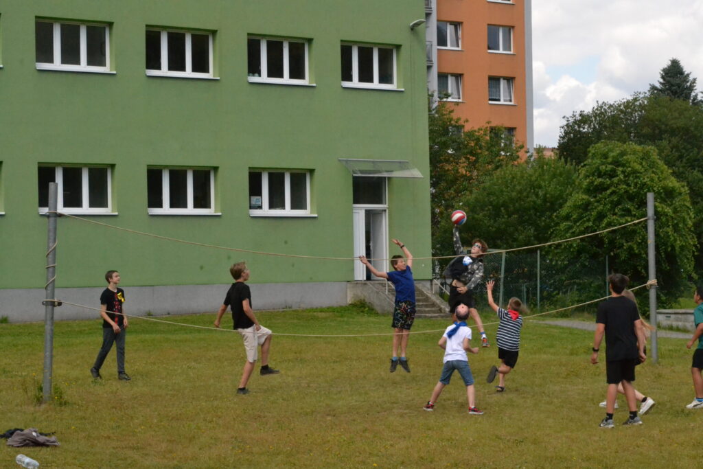 Kdo měl za sebou “poučení” na prázdniny, mohl si užívat volnou zábavu na školním hřišti. Někdo sportoval nebo zkoušel nabídnuté “retro hry” – skákání panáka, švihadlovou nebo míčovou školku, skákání s gumou apod. Asfaltové hřiště se stalo galerií, hrály se piškvorky a další hry. Areálem zněla hudba, na kterou se báječně tancovalo, o čemž svědčí např. úvodní společný tanec většiny žáků pod taktovkou K. Wetterové.